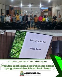 Diálogo pelo futuro sustentável de Santa Tereza do Oeste! Na última sexta-feira, 26 de setembro, foi realizada uma reunião com produtores do município para tratar de assuntos e benefícios relacionados à adesão aos programas ambientais que estão sendo implantados em nosso Municipio.Um importante passo para fortalecer a produção local, aliando desenvolvimento e preservação do meio ambiente.