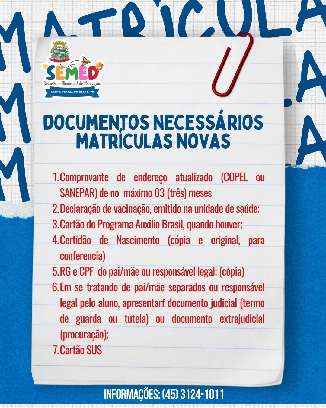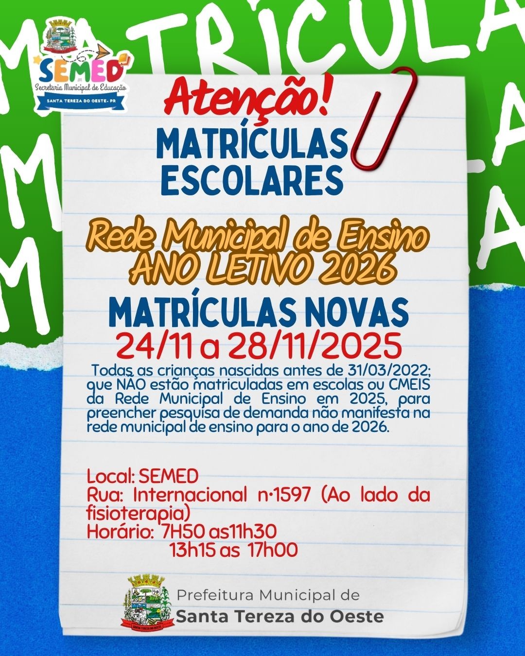 Informamos aos pais e responsáveis que, entre os dias 24 e 28 de novembro de 2025, estarão abertas as matrículas para novos alunos da Rede Municipal de Ensino (Infantil V).