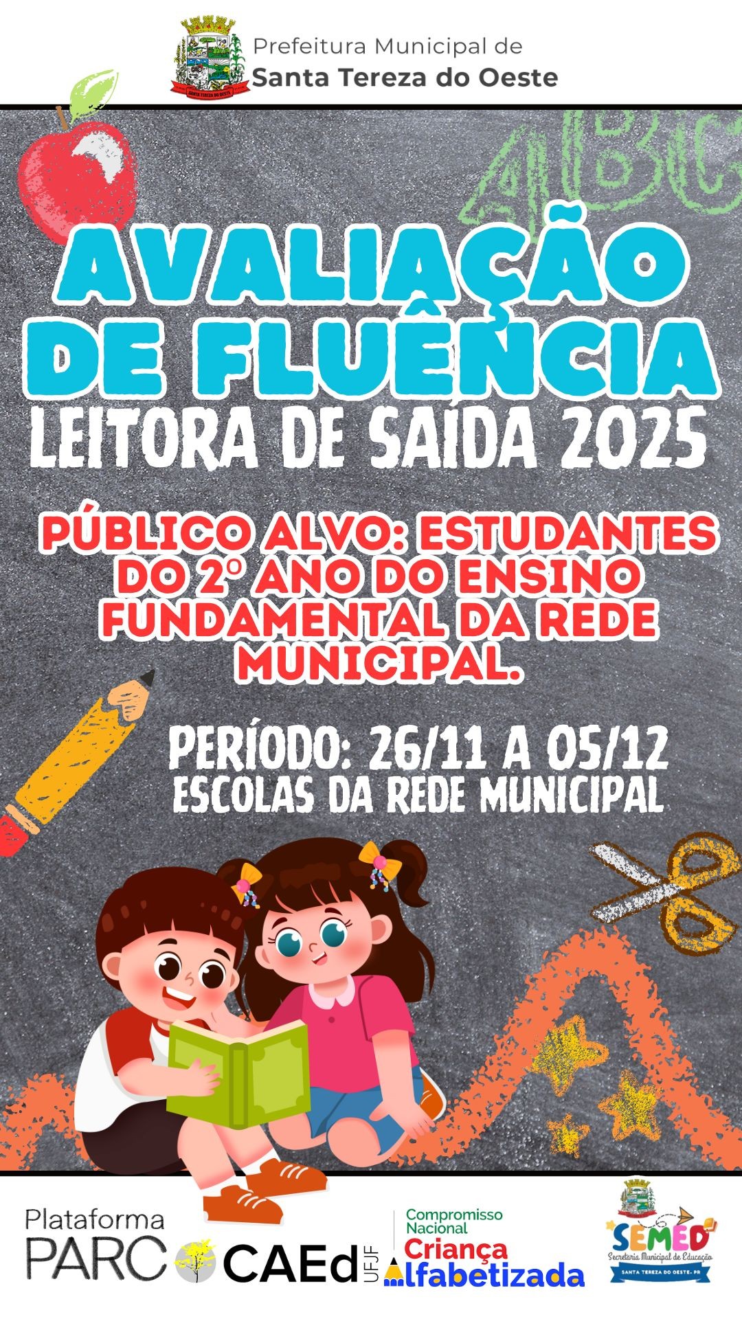 A Secretaria Municipal de Educação informa que, entre os dias 26 de novembro e 05 de dezembro de 2025, será realizada a Avaliação de Fluência de Saída para os estudantes do 2º ano do Ensino Fundamental da nossa rede municipal.